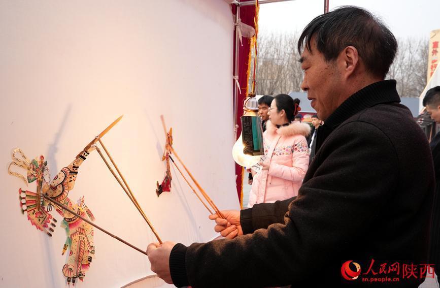 非遗传承人在灯下演绎皮影戏。人民网记者 贾凯璐摄