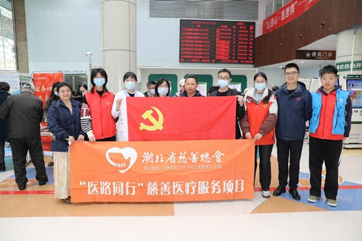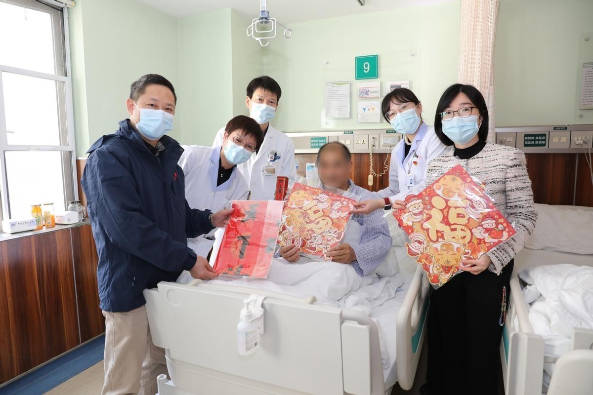 湖北省慈善总会熊胜祥副秘书长(右一)给患者送春联