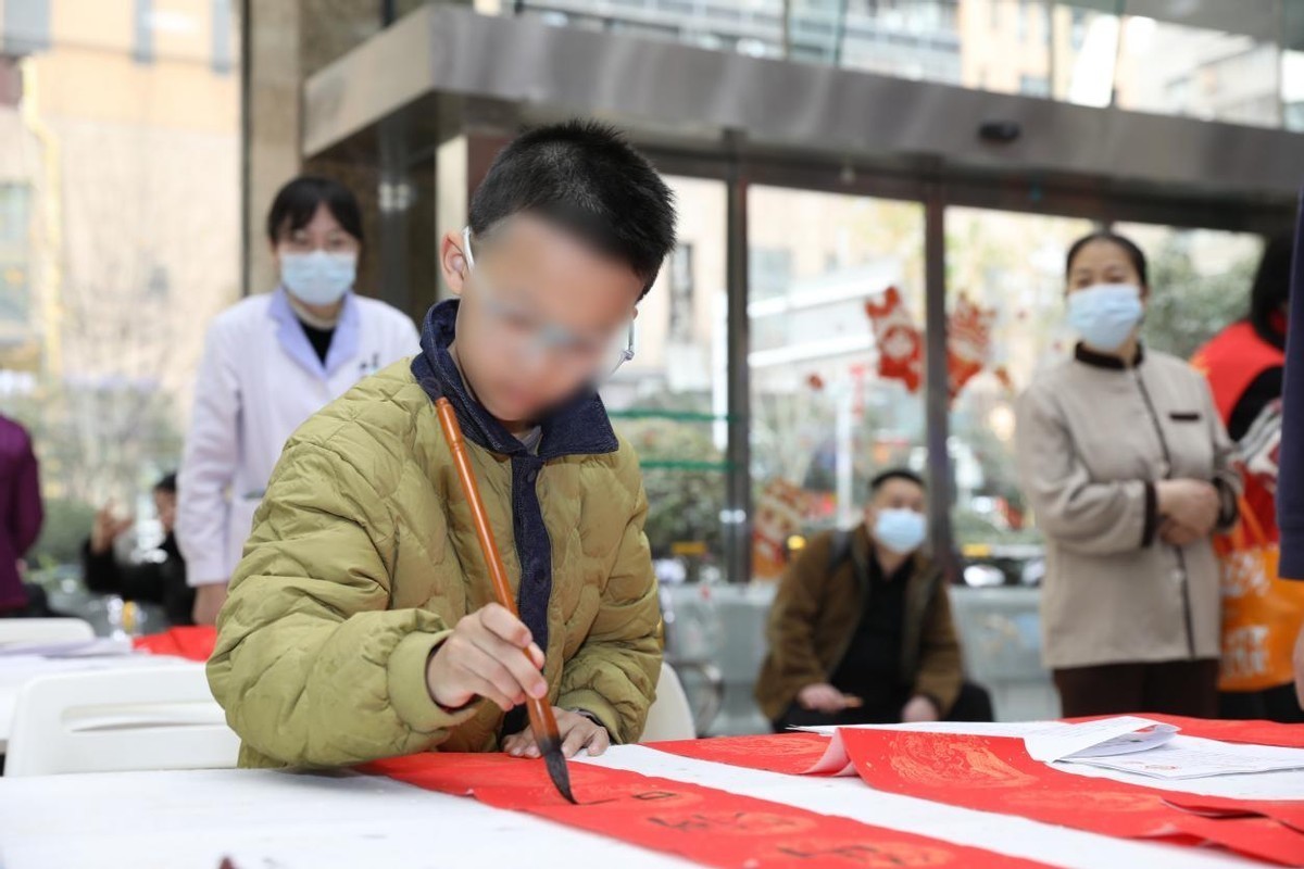 看着书法家们挥舞着手中的笔,恣意挥洒,不少人也蠢蠢欲动想体验一番,9岁的小书法爱好者湛湛就是其中一位。据了解,这次他是陪奶奶来医院复查,看到大厅正在举办写春联的活动,一时技痒,便参与了进来。“希望有一天我能成为和老师们一样厉害的书法家。”湛湛说道。